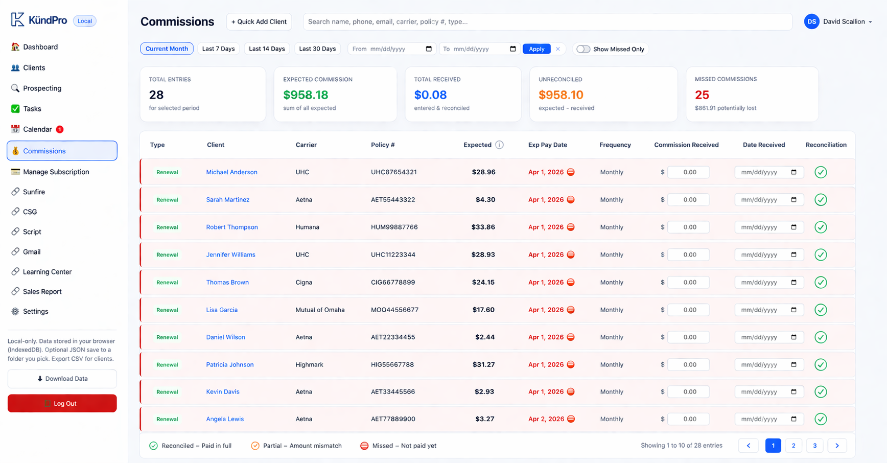 KundPro connects commission tracking directly to the policy, allowing agents to reconcile expected vs actual payments automatically without relying on a separate spreadsheet.